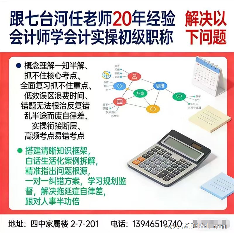 七台河及周边想学会计的朋友看过来!想找靠谱、花钱少、学实用技能的会计实操培训,还有初级会计职称考前辅导,首选任老师!任老师拥有会计师职称、20 年一线会计经验,手把手教学,零基础小白也能轻松学会。地址:七台河四中家属楼 2-7-201,电话:13946519740,学真本事、练真技能,本地口碑之选!