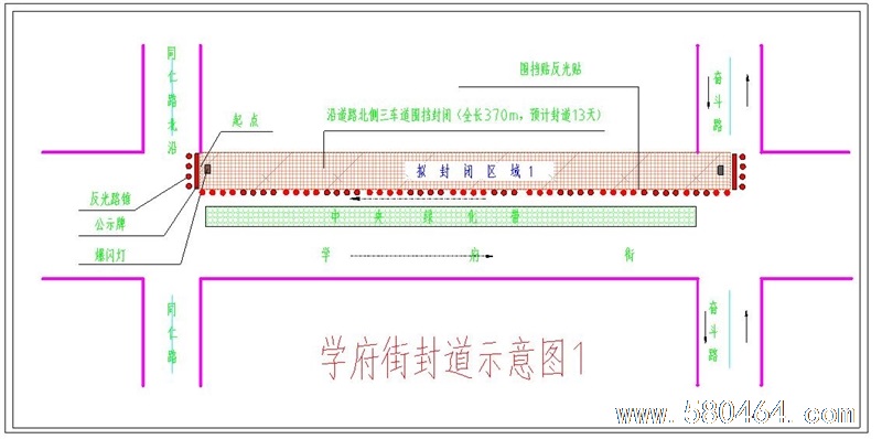 1、同仁路至奋斗路沿道路北侧三车道围挡封闭(全长370m,预计封道13天)