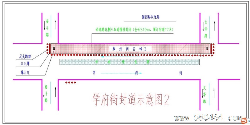 2、奋斗路至文华路沿道路北侧三车道围挡封闭(全长510m,预计封道17天)