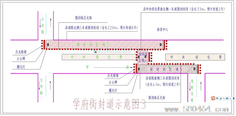 3、文华路至党校东巷道路北侧三车道围挡封闭(全长220m,预计封道8天)