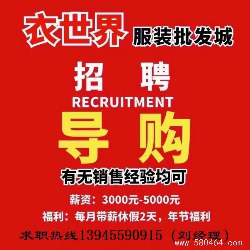 衣世界服装批发城现招聘导购员5名,保洁员1名,理货员一名,有意者可到服务台咨询,咨询电话:13945590915
